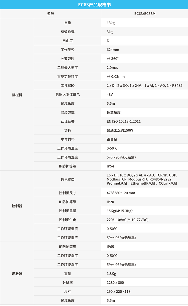 • 六自由度、自重13kg、負(fù)載3kg • 工作半徑624mm • 重復(fù)定位精度±0.03mm