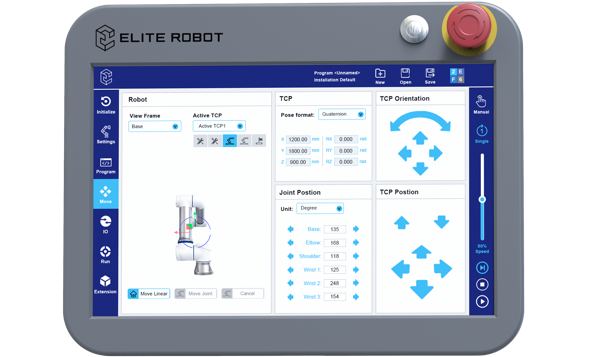 艾利特CS系列協(xié)作機(jī)器人采用新型的輕量寬屏示教器,用戶界面經(jīng)過重新設(shè)計(jì),操作直觀,支持觸屏控制?;趯?duì)用戶使用習(xí)慣的理解,艾利特優(yōu)化了編程流程,并簡化了編程步驟,只需在示教器上點(diǎn)擊幾下,便可完成編程,從而減輕用戶學(xué)習(xí)負(fù)擔(dān),上手更快速,幫助用戶和集成商加快項(xiàng)目開發(fā)周期。用戶能充分體驗(yàn)到CS系列簡約現(xiàn)代的外觀,以及工具欄中醒目而直觀的圖標(biāo),導(dǎo)航更方便,使用更流暢。