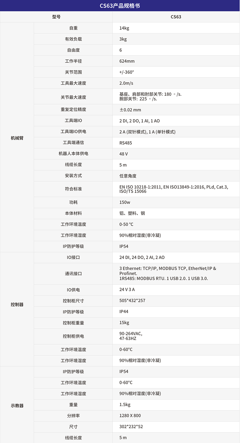 CS63具有小而強(qiáng)大的特點(diǎn),它的有效載荷為3公斤,工作半徑為624mm。所有腕關(guān)節(jié)可以進(jìn)行360度旋轉(zhuǎn),末端關(guān)節(jié)可以無限旋轉(zhuǎn)。作為桌面式協(xié)作機(jī)器人,它可以輕松處理高精度任務(wù)和輕型裝配任務(wù)。