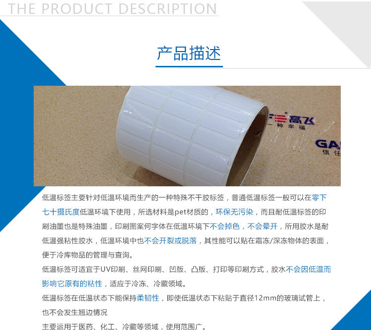 低溫標(biāo)簽主要針對(duì)低溫環(huán)境而生產(chǎn)的一種特殊不干膠標(biāo)簽,普通低溫標(biāo)簽一般可以在零下七十?dāng)z氏度低溫環(huán)境下使用,所選材料是pet材質(zhì)的,環(huán)保無(wú)污染,而且耐低溫標(biāo)簽的印刷油墨也是特殊油墨,印刷圖案何字體在低溫環(huán)境下不會(huì)掉色,不會(huì)暈開(kāi),所用膠水是耐低溫強(qiáng)粘性膠水,低溫環(huán)境中也不會(huì)開(kāi)裂或脫落,其性能可以貼在霜凍/深凍物體的表面,便于冷庫(kù)物品的管理與查詢。