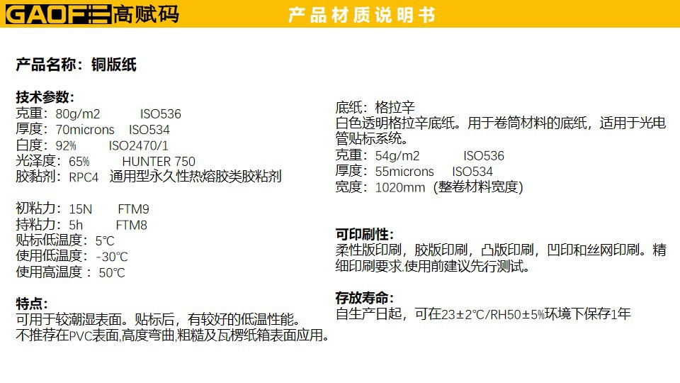 印刷及加工: 經(jīng)超級砑光處理的半高光表面,非常適合用于各種印刷工藝進(jìn)行單色及彩色印刷。