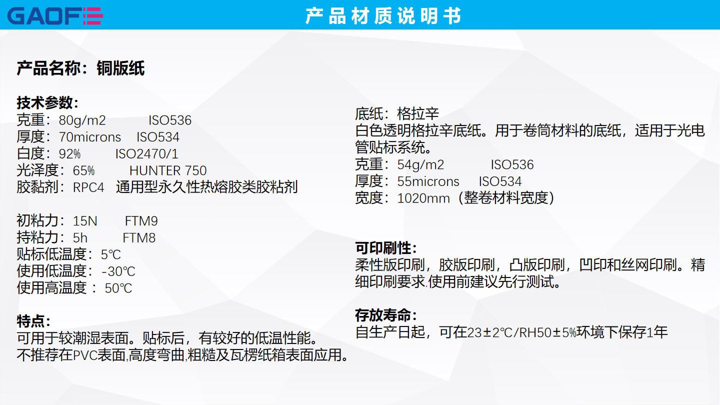 印刷及加工: 經(jīng)超級砑光處理的半高光表面,非常適合用于各種印刷工藝進(jìn)行單色及彩色印刷。