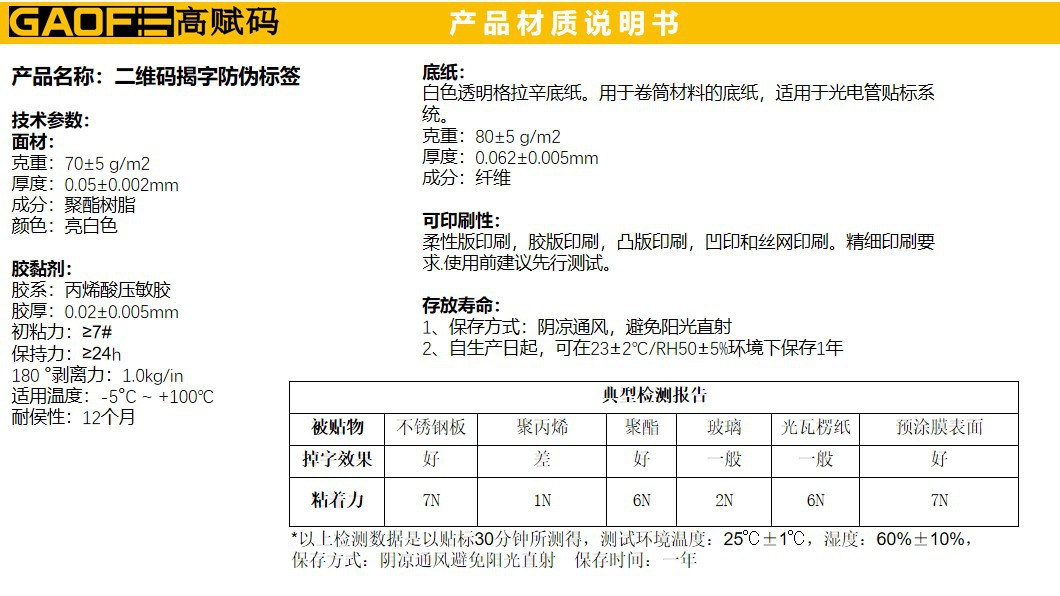 二維碼揭字防偽標簽 50#白色大字VOID 彩色涂層高光亮白-高賦碼