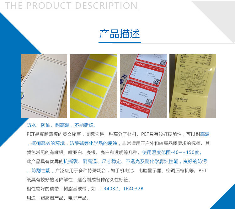 PET標(biāo)簽聚酰亞胺薄膜為基材,涂以特種壓敏膠而成,具有較好的耐化學(xué)性和耐磨性,耐溫范圍200℃~600℃,對助焊劑、熔融劑和清潔劑等化學(xué)物質(zhì)具有抗腐蝕作用,使用于高溫和磨損的極端惡劣的環(huán)境中能保持原本性能。它是專為印刷電路板用字符或條形碼標(biāo)簽而設(shè)計(jì),因?yàn)樗梢越?jīng)受生產(chǎn)印刷電路板過程中所面臨的焊接劑、熔融劑等的侵蝕。目前厚度主要是25um、50um兩種。常用的顏色是黑色和白色 。PET標(biāo)簽廣泛地應(yīng)用于眾多電子產(chǎn)品的SMT及波峰制程中、主機(jī)板、腐蝕產(chǎn)品、手機(jī)及鋰電池等產(chǎn)品的PCB板高溫標(biāo)簽。