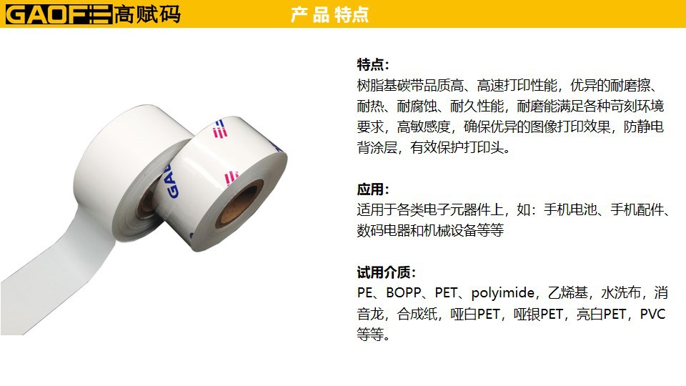 洗水嘜碳帶品質(zhì)高、高速打印性能,優(yōu)異的耐磨擦、耐熱、耐腐蝕、耐久性能,耐磨能滿(mǎn)足各種苛刻環(huán)境要求,高敏感度,確保優(yōu)異的圖像打印效果,防靜電背涂層,有效保護(hù)打印頭。