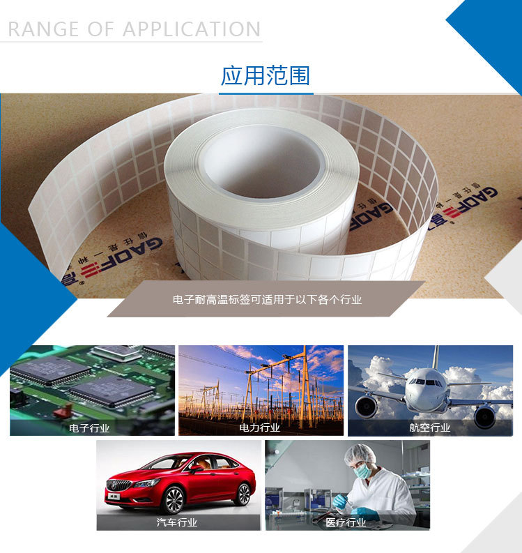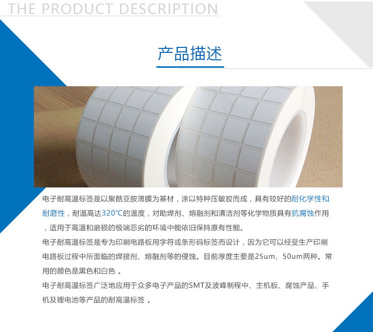 高溫標簽聚酰亞胺薄膜為基材,涂以特種壓敏膠而成,具有較好的耐化學性和耐磨性,耐溫范圍200℃~600℃,對助焊劑、熔融劑和清潔劑等化學物質(zhì)具有抗腐蝕作用,使用于高溫和磨損的極端惡劣的環(huán)境中能保持原本性能。它是專為印刷電路板用字符或條形碼標簽而設計,因為它可以經(jīng)受生產(chǎn)印刷電路板過程中所面臨的焊接劑、熔融劑等的侵蝕。目前厚度主要是25um、50um兩種。常用的顏色是黑色和白色 。高溫標簽廣泛地應用于眾多電子產(chǎn)品的SMT及波峰制程中、主機板、腐蝕產(chǎn)品、手機及鋰電池等產(chǎn)品的PCB板高溫標簽。