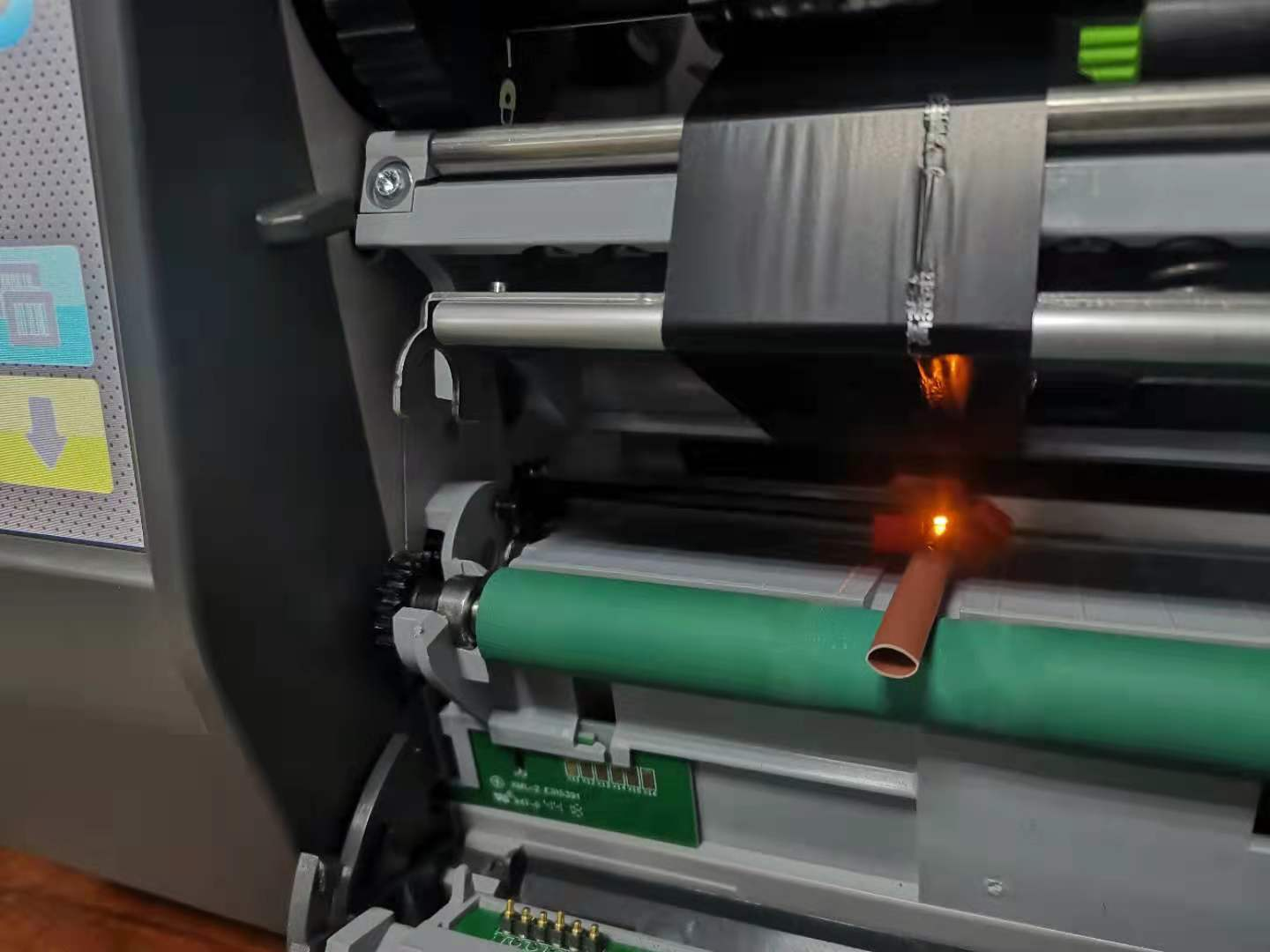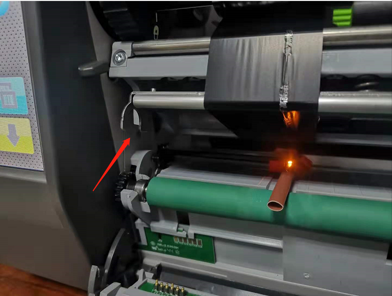 技術(shù)員:增加壓力就能打印清晰了,麻煩取下切刀,抬起打印頭,然后拍照打印機正面圖。