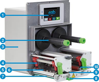 標(biāo)簽剝離之后,下一張標(biāo)簽會退回打印頭后方。借此確保標(biāo)簽前緣仍可打印并防止殘膠因長時(shí)間等待而溢出。使用敏感材質(zhì)時(shí),打印頭可抬起以避免碳帶起皺折。